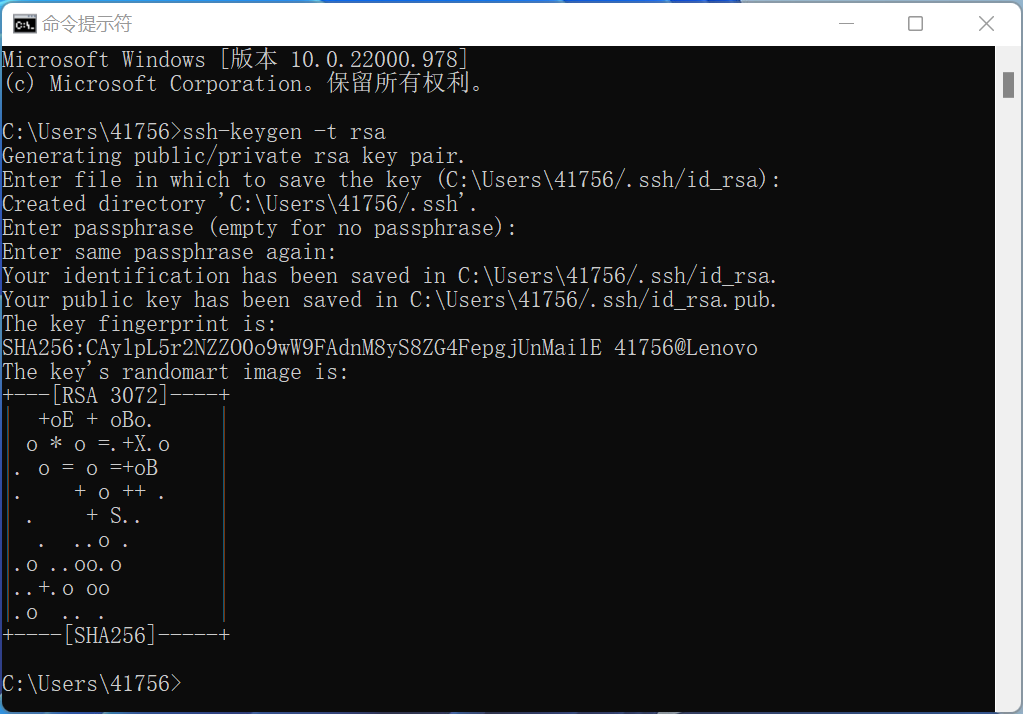 在windows 11,打开cmd,输入ssh-keygen -t rsa命令