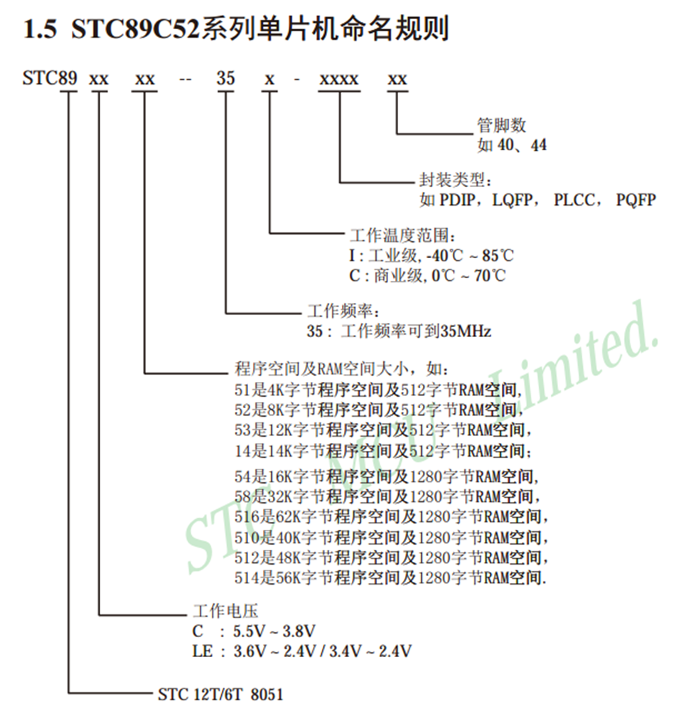 - STC(宏晶):STC89C51、STC90C51、STC11系列、STC15系列、STC8系列等。