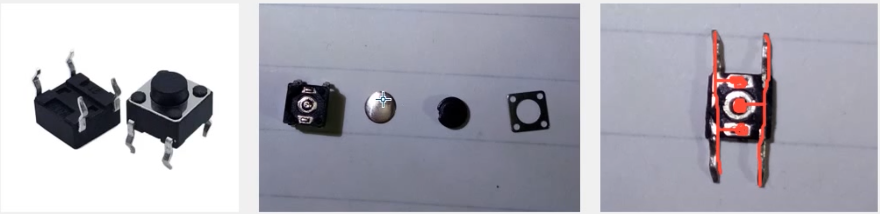 •轻触按键:相当于是一种电子开关,按下时开关接通,松开时开关断开,实现原理是通过轻触按键内部的金属弹片受力弹动来实现接通和断开。