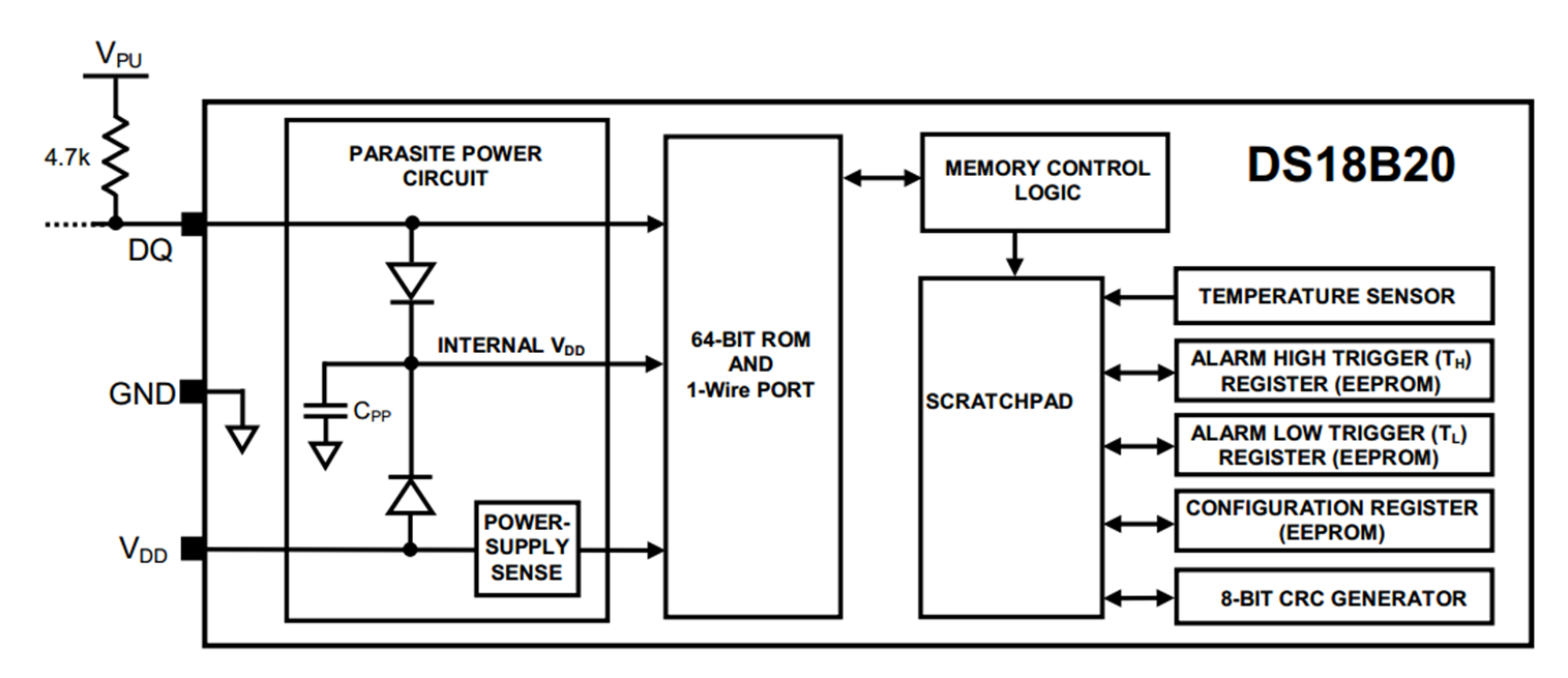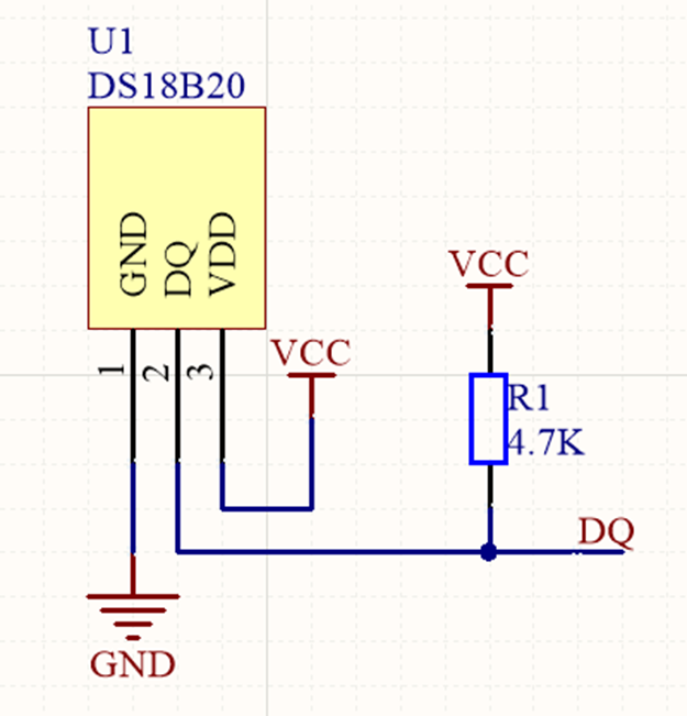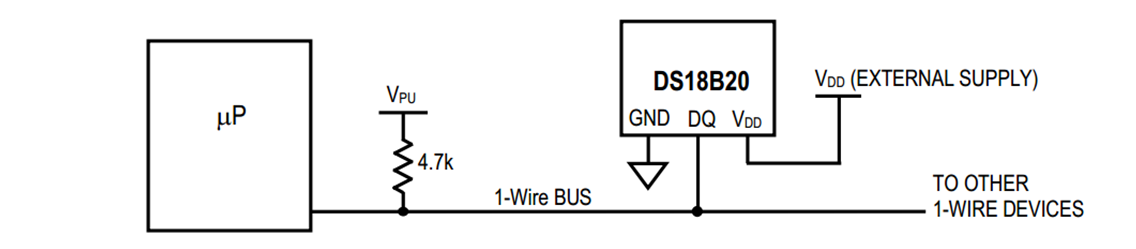 单总线只需要一根通信线即可实现数据的双向传输,当采用寄生供电时,还可以省去设备的VDD线路,此时,供电加通信只需要DQ和GND两根线。