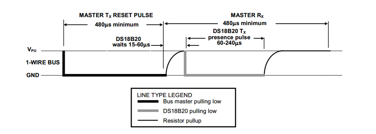 主机将总线拉低至少480us,然后释放总线,等待15~60us后,存在的从机会拉低总线60~240us以响应主机,之后从机将释放总线。
