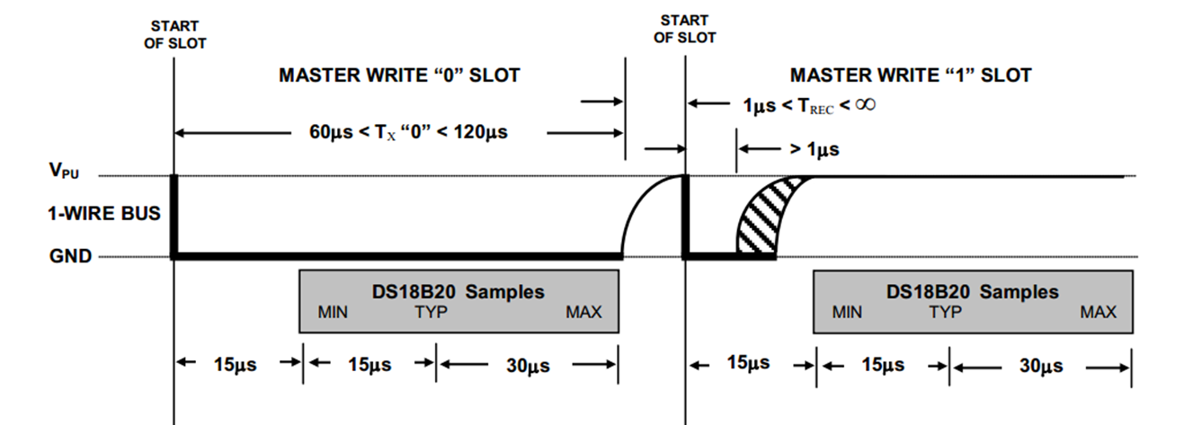 主机将总线拉低60~120us,然后释放总线,表示发送0;主机将总线拉低1~15us,然后释放总线,表示发送1。从机将在总线拉低30us后(典型值)读取电平,整个时间片应大于60us。