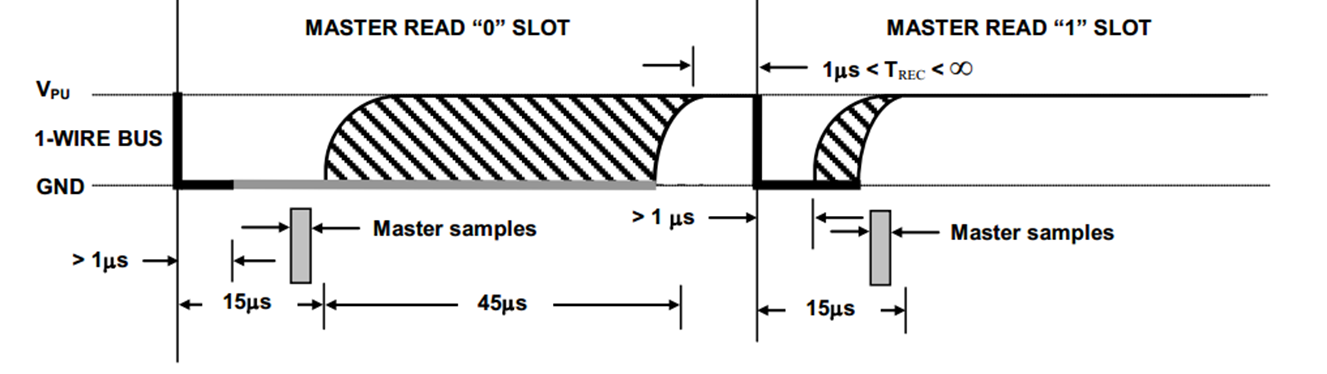主机将总线拉低1~15us,然后释放总线,并在拉低后15us内读取总线电平(尽量贴近15us的末尾),读取为低电平则为接收0,读取为高电平则为接收1 ,整个时间片应大于60us。