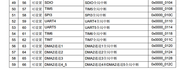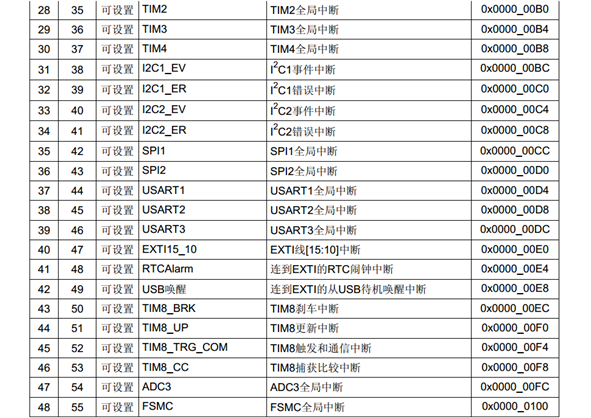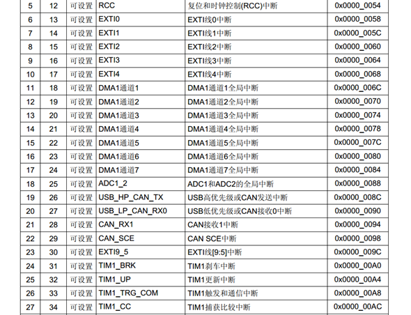 68个可屏蔽中断通道,包含EXTI、TIM、ADC、USART、SPI、I2C、RTC等多个外设。