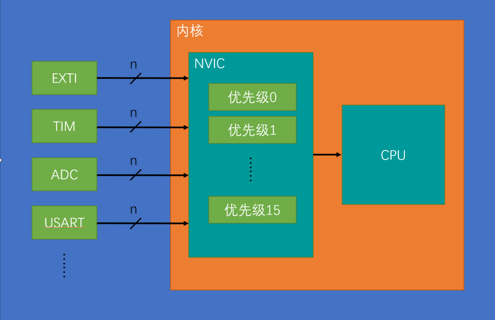 使用NVIC统一管理中断,每个中断通道都拥有16个可编程的优先等级,可对优先级进行分组,进一步设置抢占优先级和响应优先级。