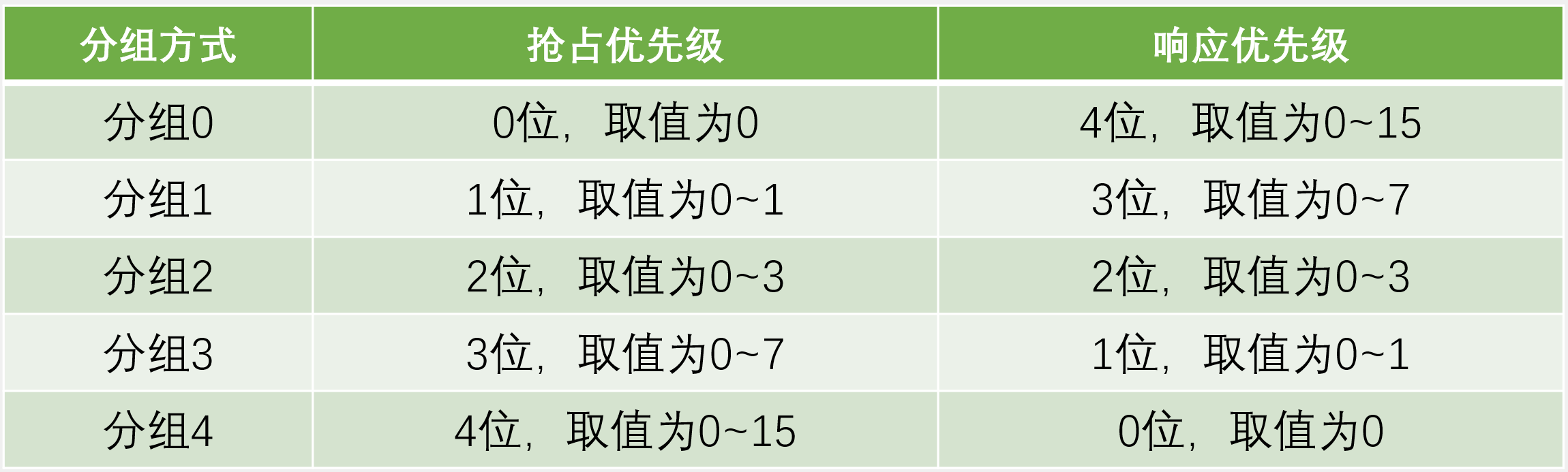 NVIC的中断优先级由优先级寄存器的4位(0~15)决定,这4位可以进行切分,分为高n位的抢占优先级和低4-n位的响应优先级。