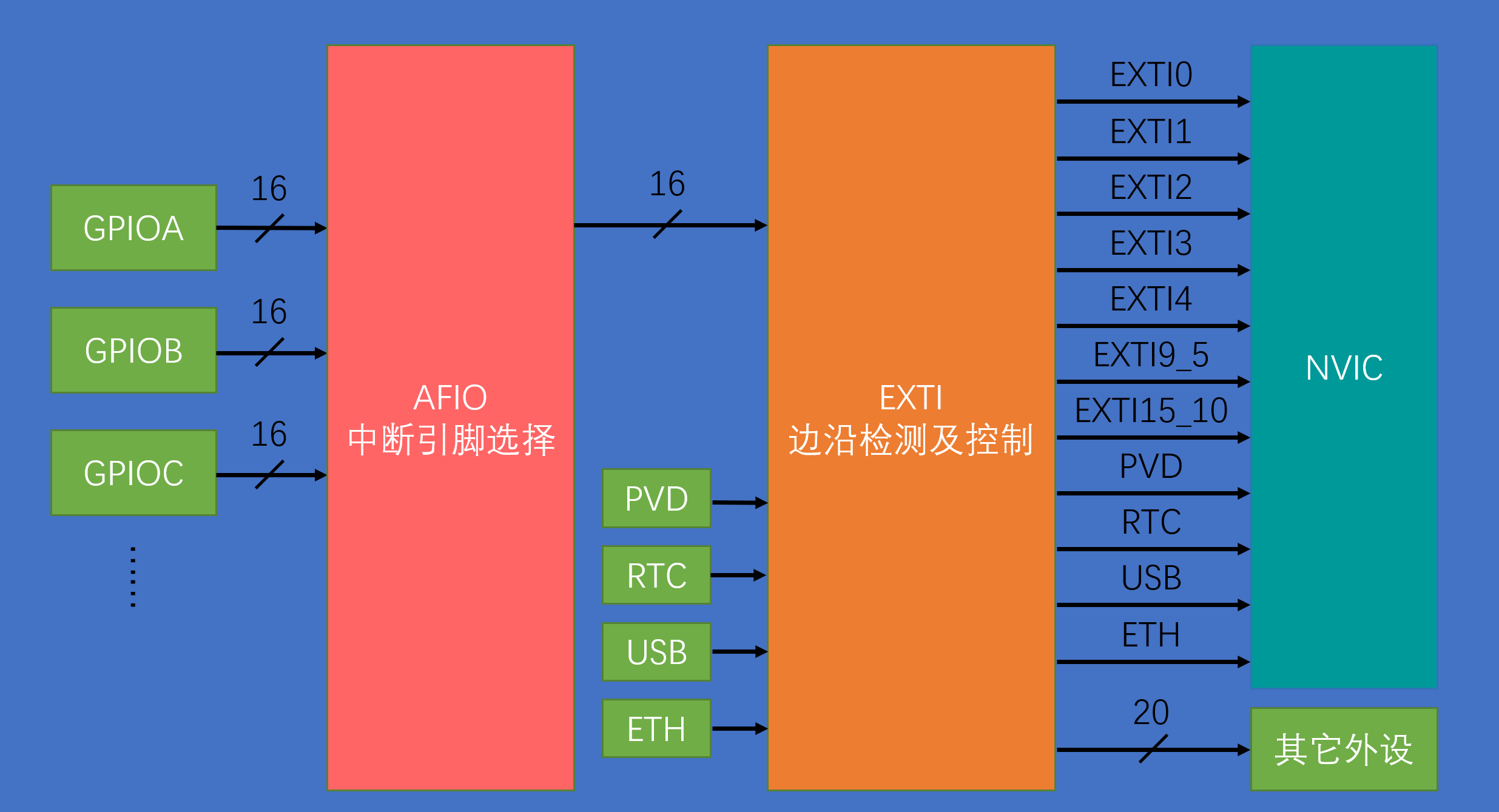 通道数:16个GPIO_Pin,外加PVD输出、RTC闹钟、USB唤醒、以太网唤醒。