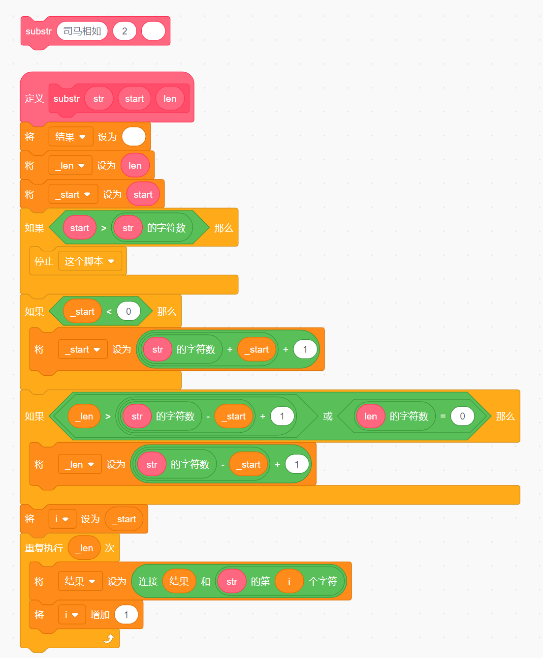 如果不存在参数len,那么返回自start位置开始至最后的所有字符,等同于将len设为总字符数减去start,然后再加1.