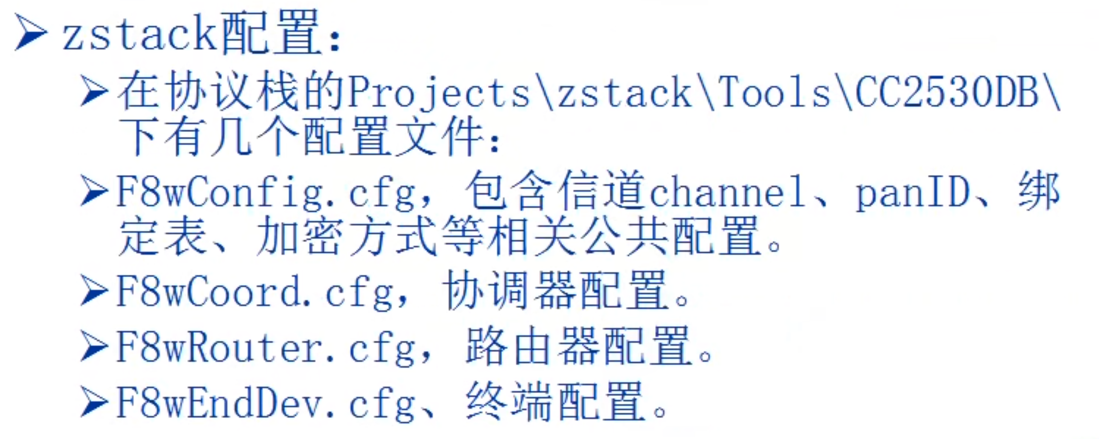每一个端点应用都对应一个配置文件(Profile)。Profile配置文件包括: 设备ID (Device ID)、事务集群ID(cluster ID)、属性ID (Attribute ID)等等。AF可以通过这些信息来决定服务类型。