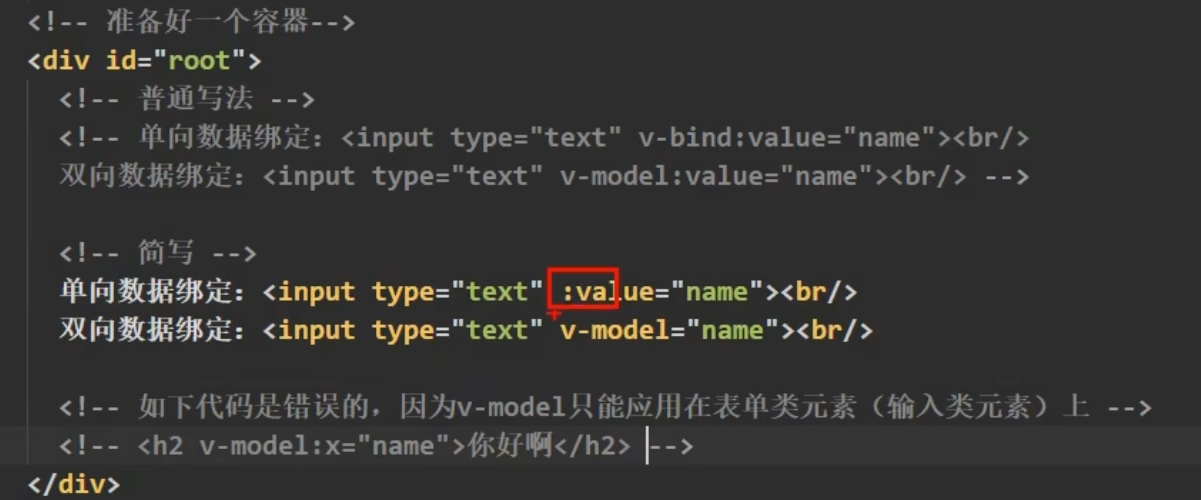 备注:Vue中有很多的指令,且形式都是: v-????,此处我们只是拿v-bind举个例子。