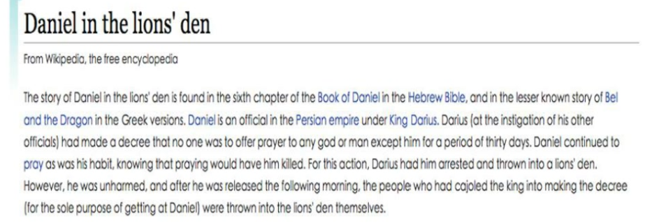 The story of Daniel in the lions den is found in the sixth chapter of the Book of Daniel in the Hebrew Bible, and in the lesser known story of Beland the Drogon in the Greek versions.Daniel is an officia in the Persian empire under King Darius.Darus (at the instigation of his otheroficiols) had made a decree that no one was to offer prayer to any god o man except him for a period of thity days.Daniel continued topray as was his habit knowing that praying would have him illed.For this action, Dorius had him arrested and thrown into a lions’ den.However, he was unharmed, and after he was released thefolowing marming, the people who had cojpled the king into moking the decree(for the sole purpose of getting at Daniel) were thrown into the lions’den themselves.