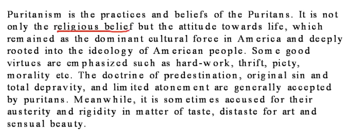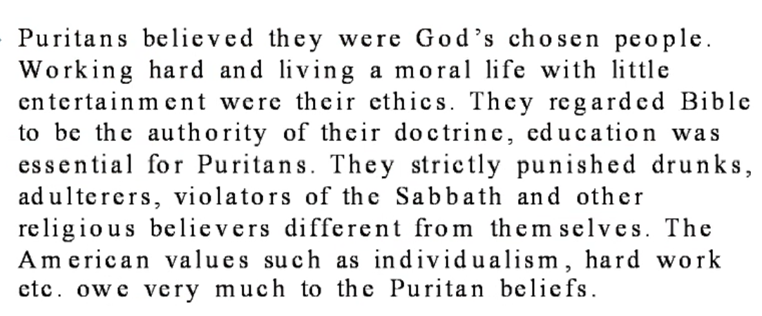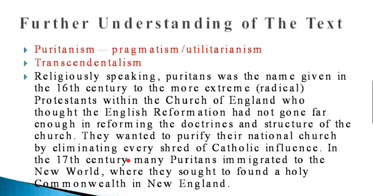 Religiously speaking , puritans was the name given in the 16th century to the more extreme (radical) Protestants(新教徒) within the Church of England who thought the English Reformation had not gone far enough in reforming the doctrines and structure of the church. They wanted to purify their national church by eliminating every shred of Catholic influcnce. In the 17th century many Puritans immigratcd to the New World, where they sought to found a holy Commonwealth in New England .