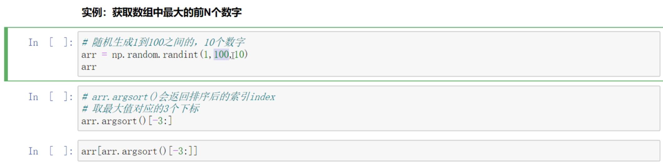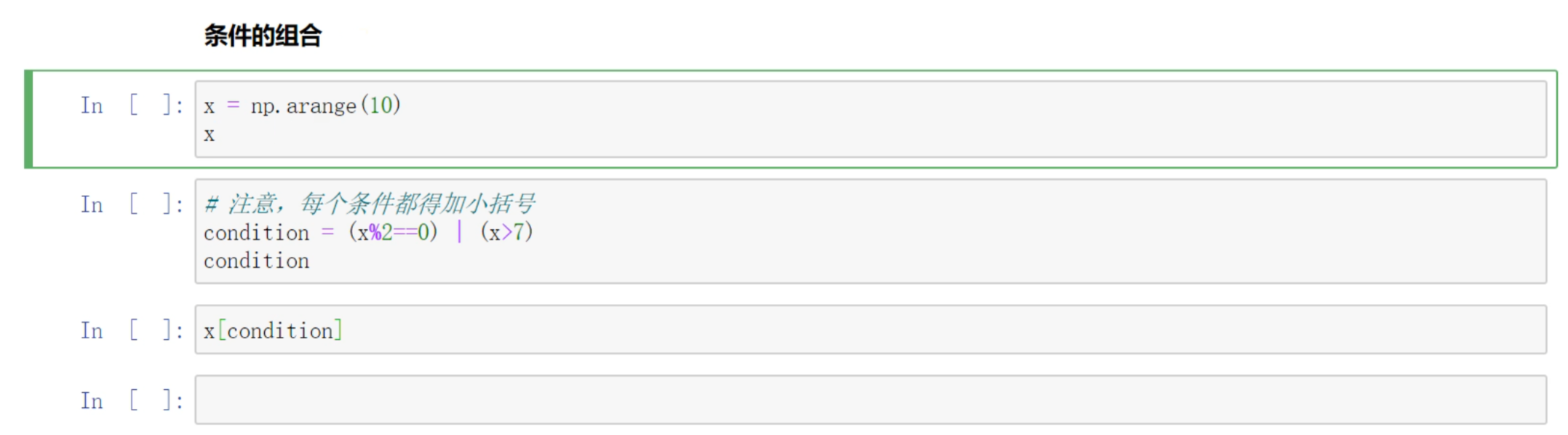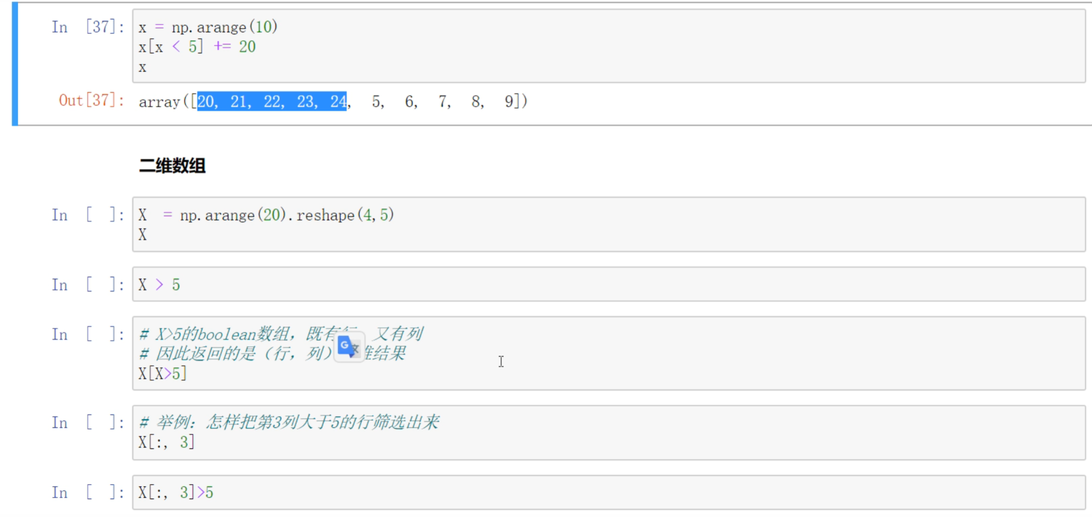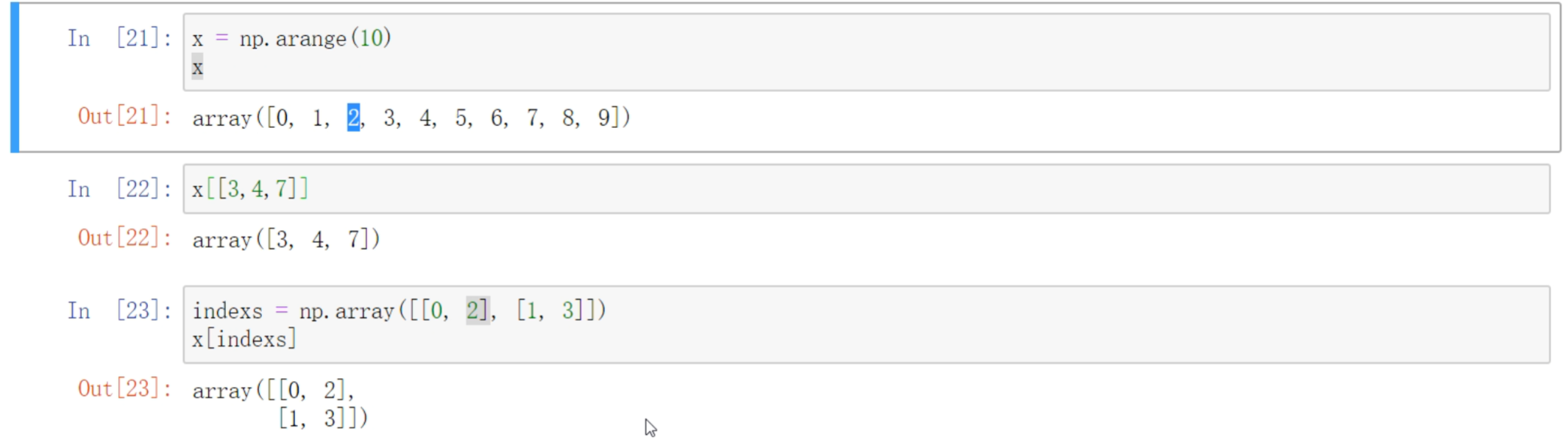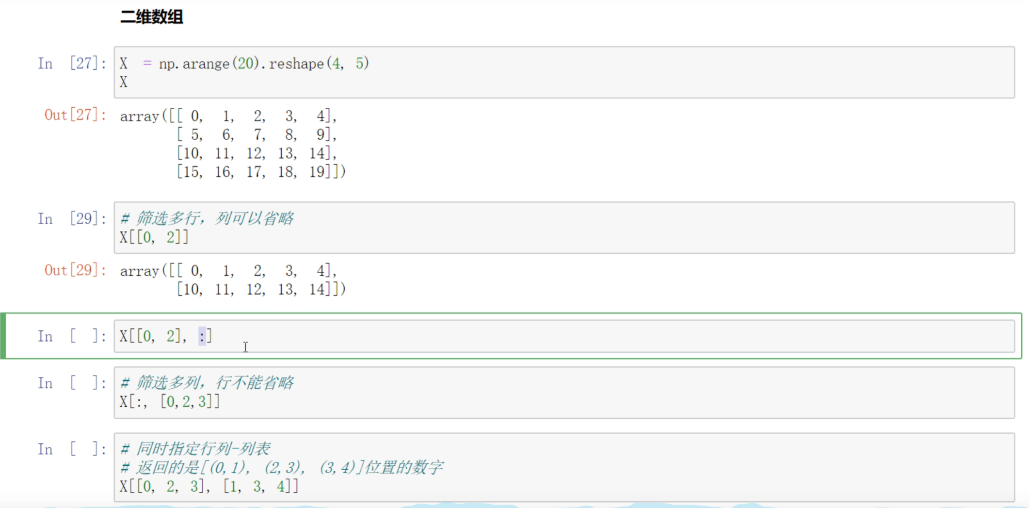 X[:2,2:4]: 筛选多行,然后筛选多列。