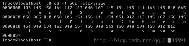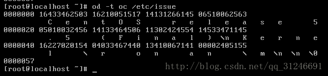 当我们执行 od -t oc /etc/issue 时,如下图: